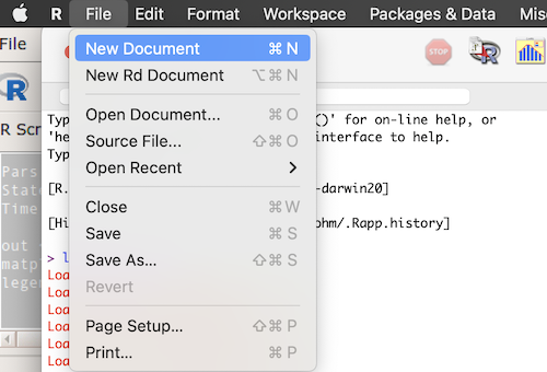 Figure 2. Screenshot of the macOS R.app console, selecting the New Document option.