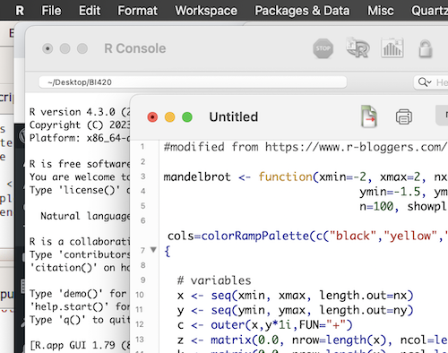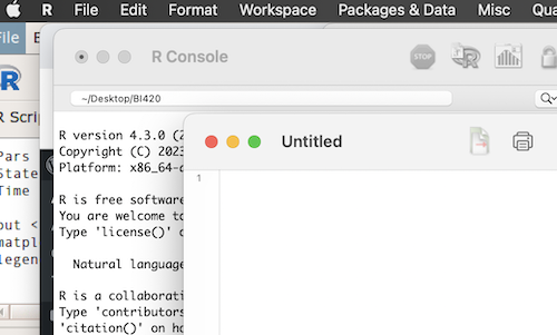 Figure 3. Screenshot of the open script editor and macOS R.app console in the background.