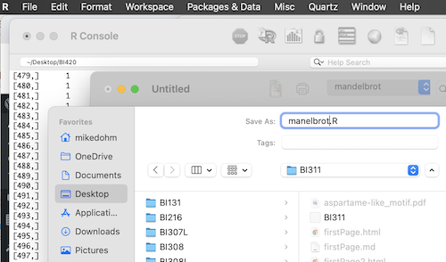 Figure 5. Screenshot file save as box in the script editor and macOS R.app console in the background.